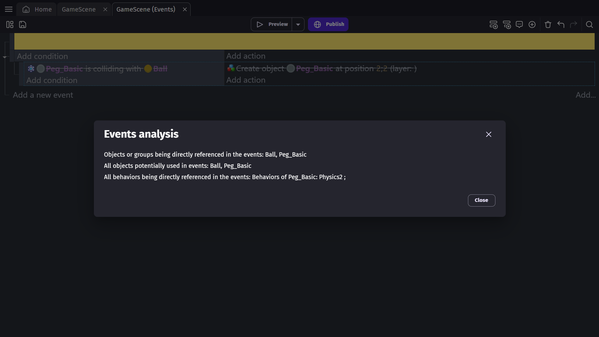 The diagnostic report helps you find issues in your events such as missing actions, conditions, or expressions from extensions, as well as invalid parameters. When the Events Editor detects problems, they are shown with a red underline.