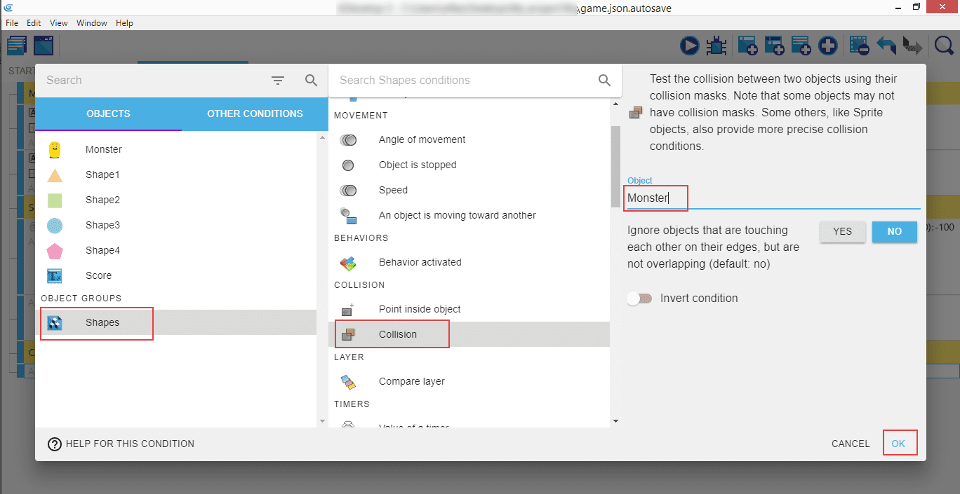 As always, make sure "Shapes" are selected, then look for "Collision" (which will test the collision between two objects). In the right panel enter the "Monster" and click "Ok".